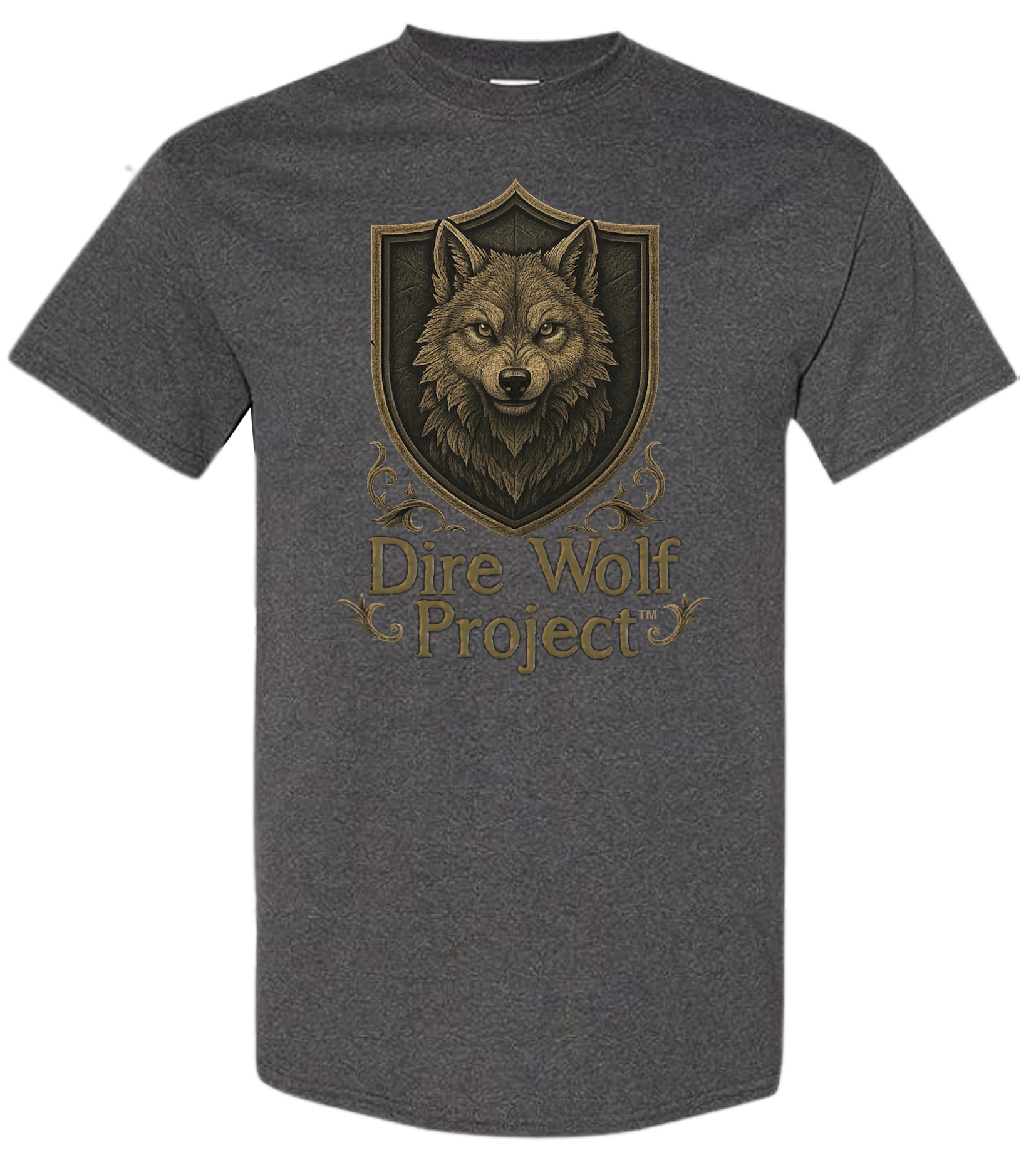 At the center of the shirt stands a dire wolf shield, forged in the look of burnished copper... scarred, battle-ready, and unyielding. The dire wolf’s face emerges from the metal with steady strength, not rage. This is not a beast of chaos.