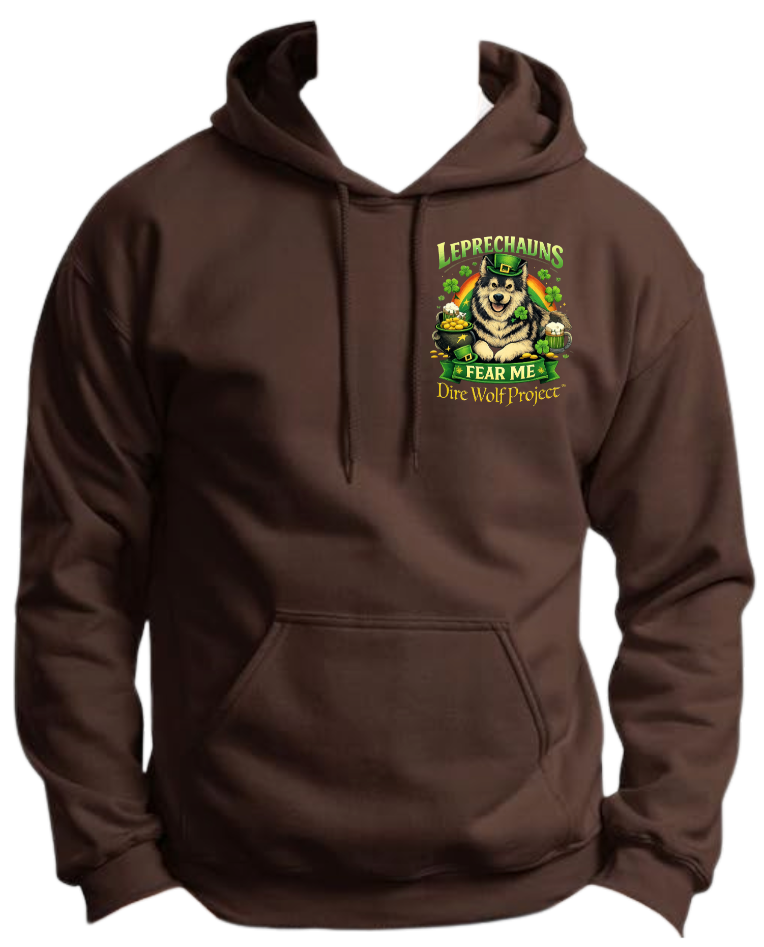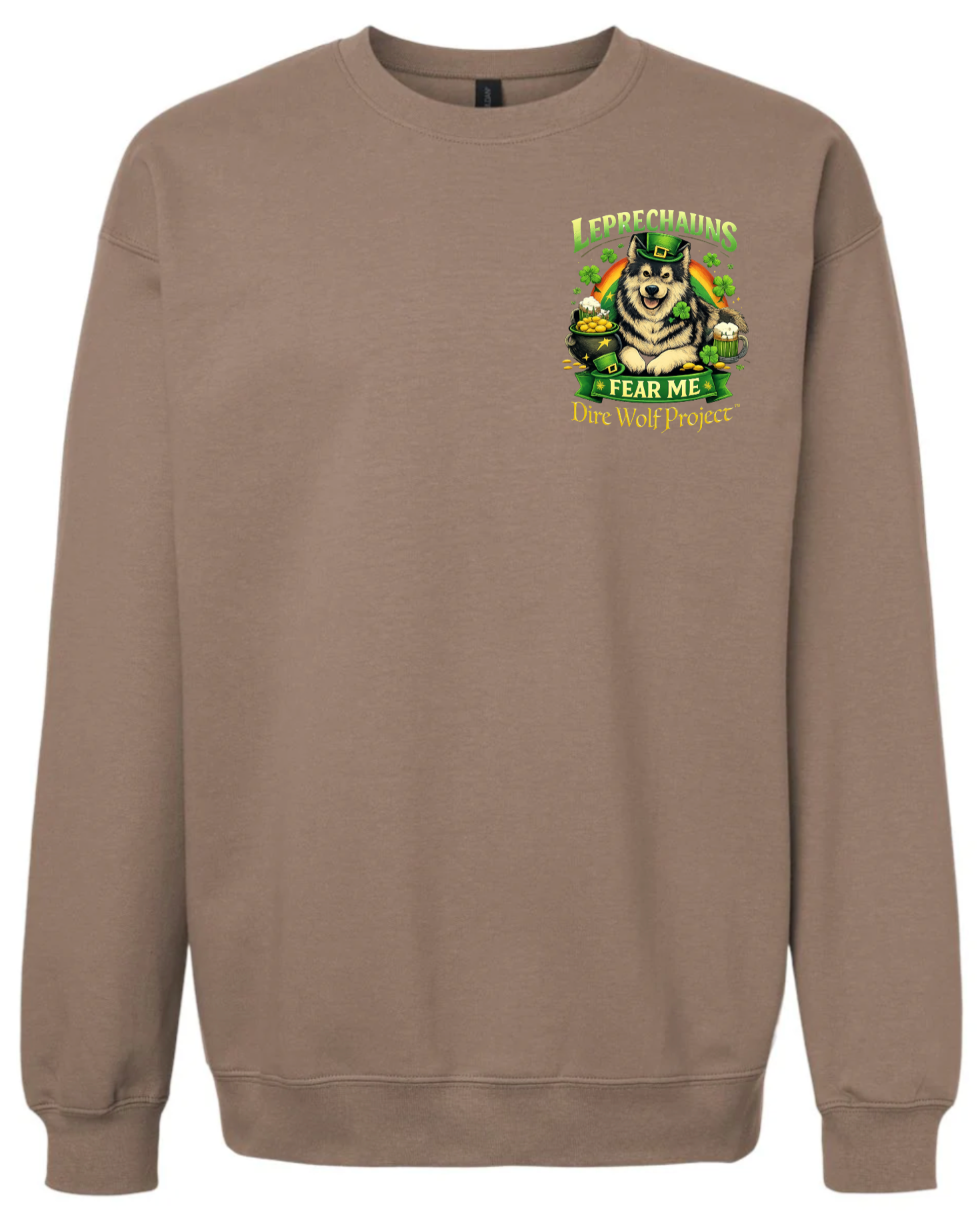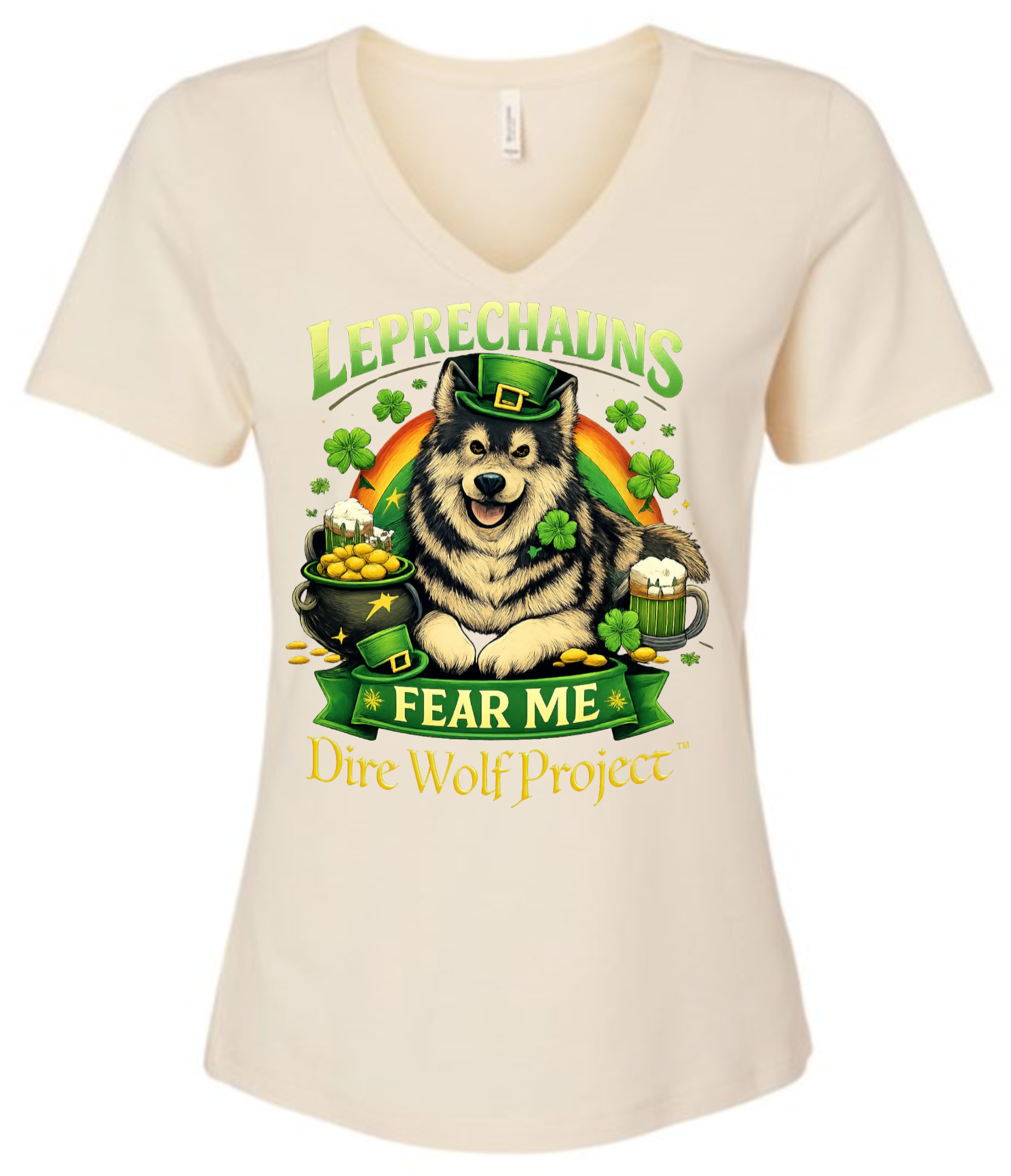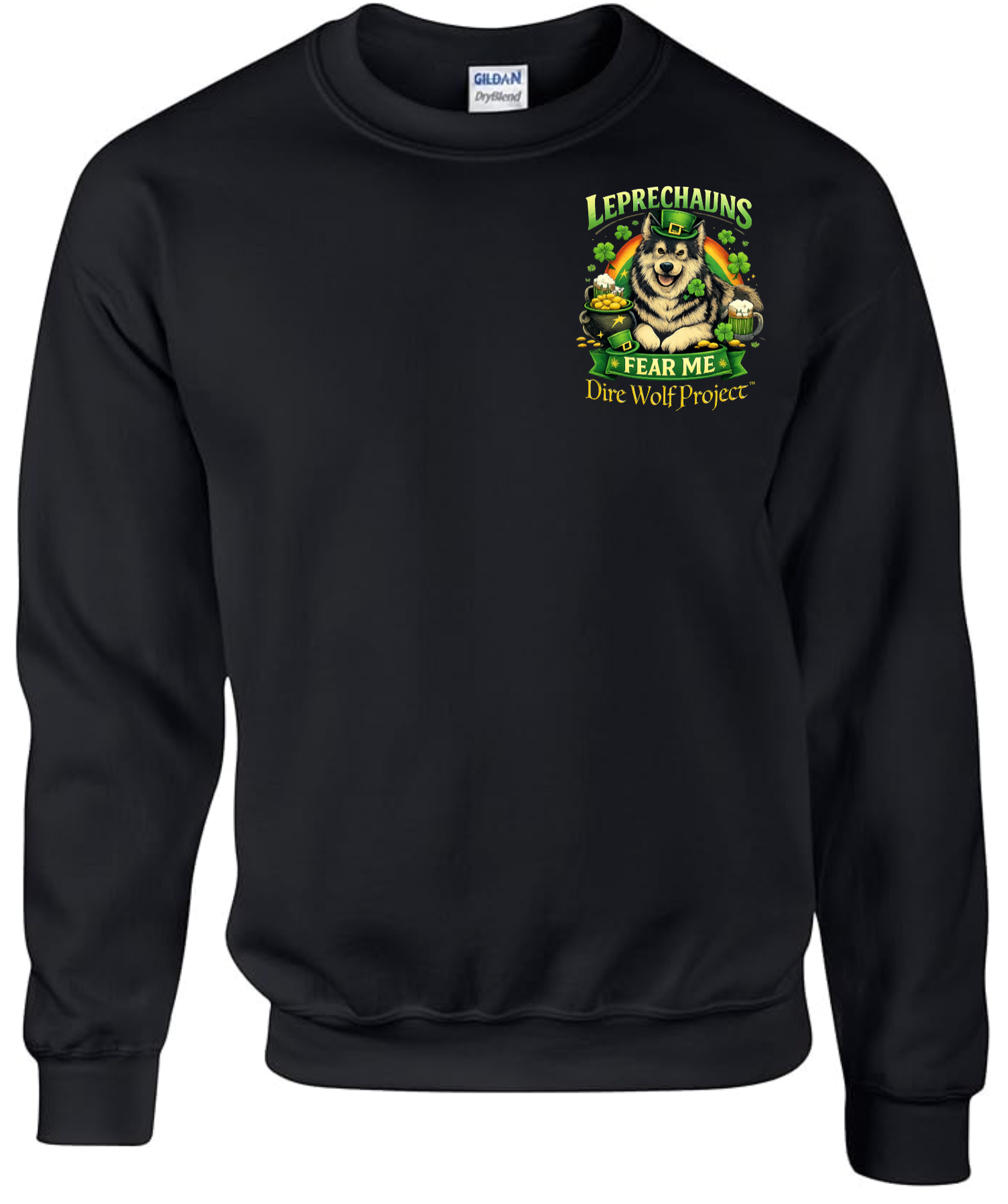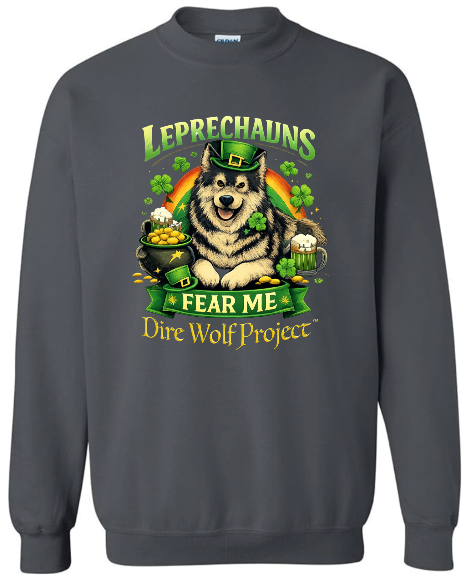 “LEPRECHAUNS FEAR ME” is a Dire Wolf Project gift shop favorite for March, built for people who want their wardrobe to say: “I am friendly, I am formidable, and I absolutely have a dog that would lick a mythological creature into surrender.”