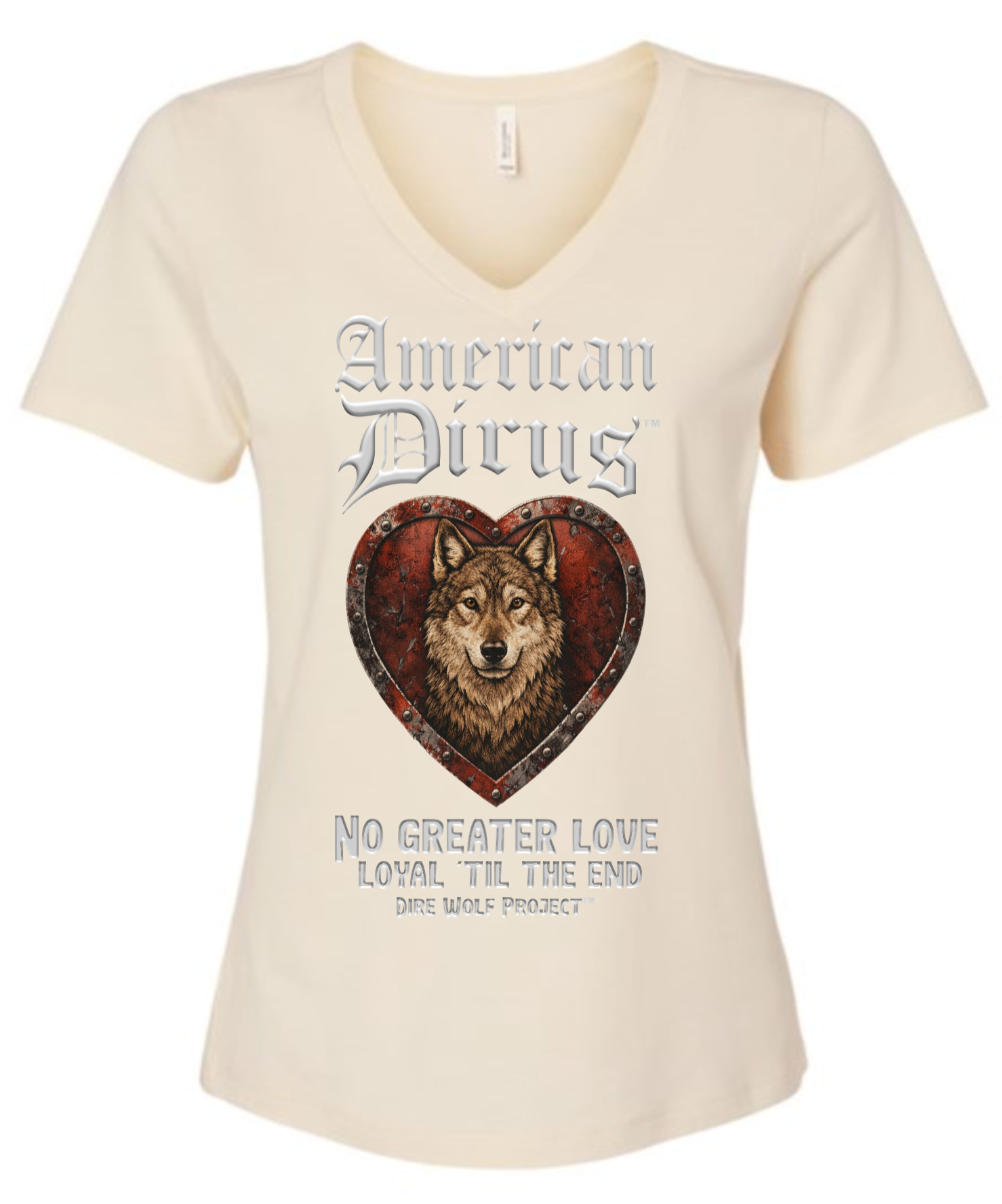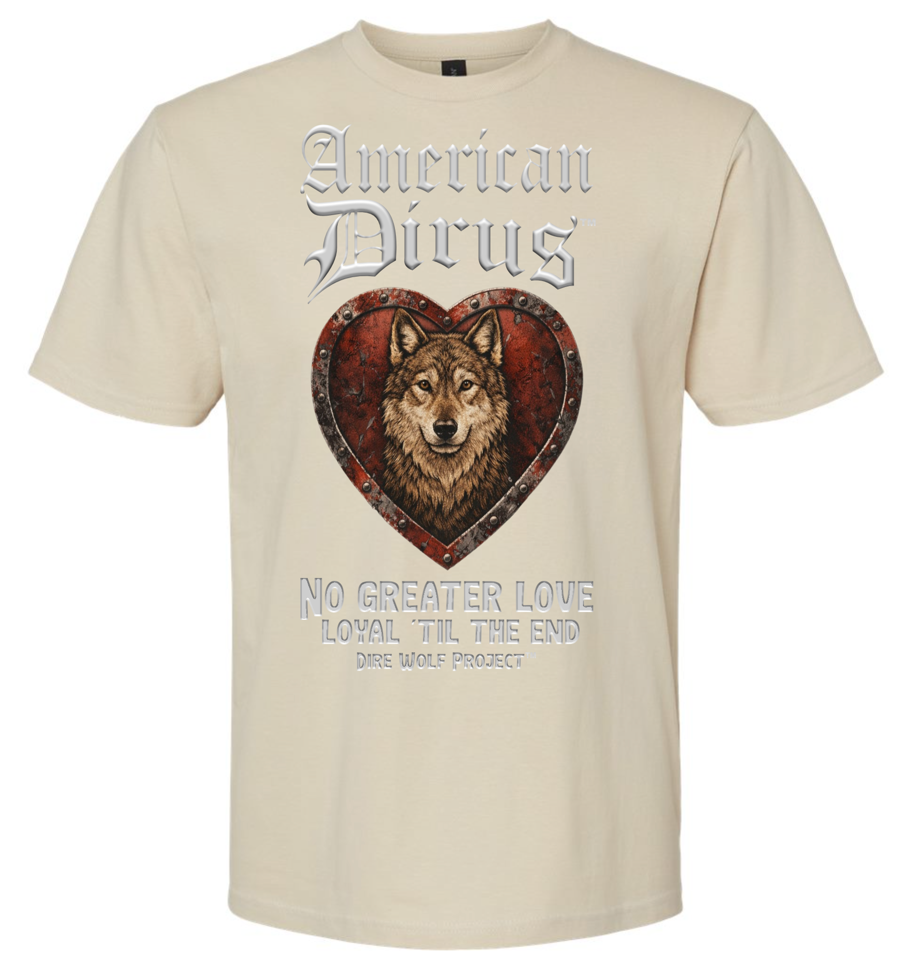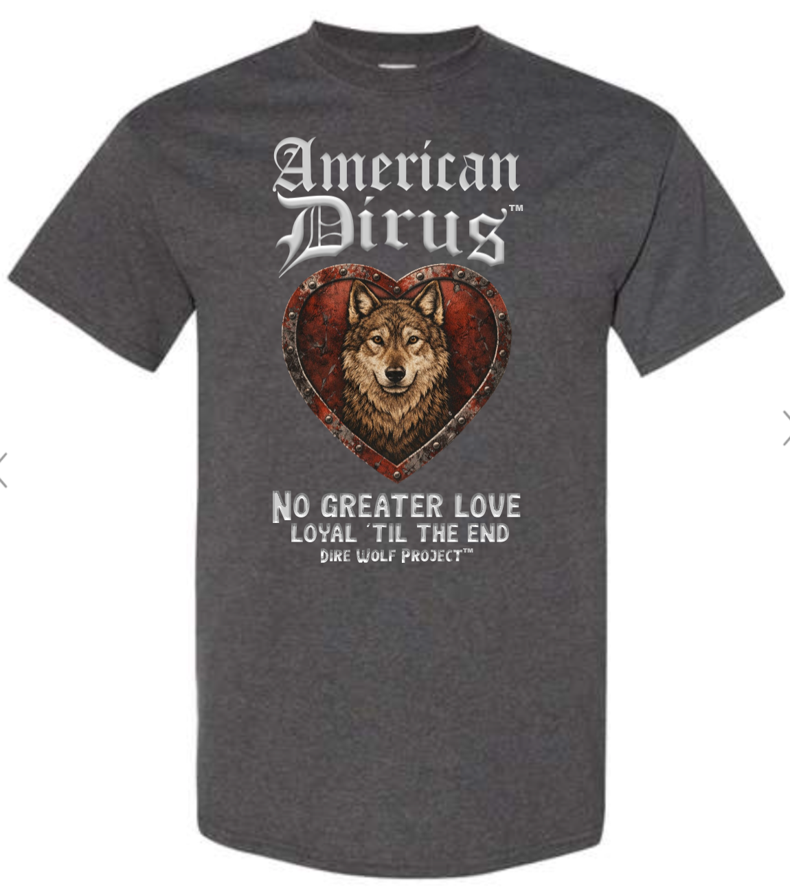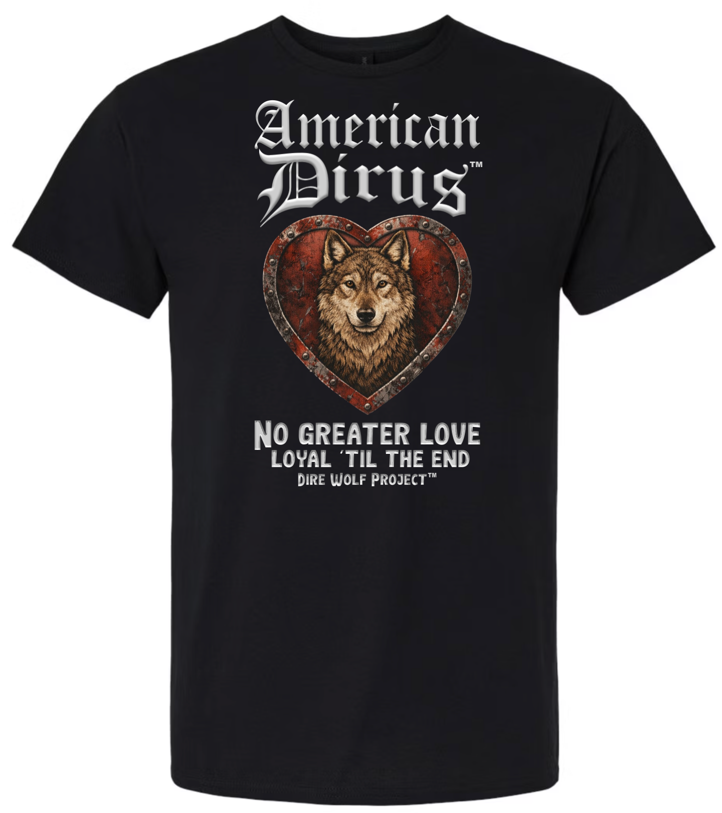 At the center of this shirt stands an American Dirus™, framed within a weathered heart of deep crimson and steel. The heart is not delicate. It is forged. Reinforced. Riveted like armor. Because the love it represents was never fragile.