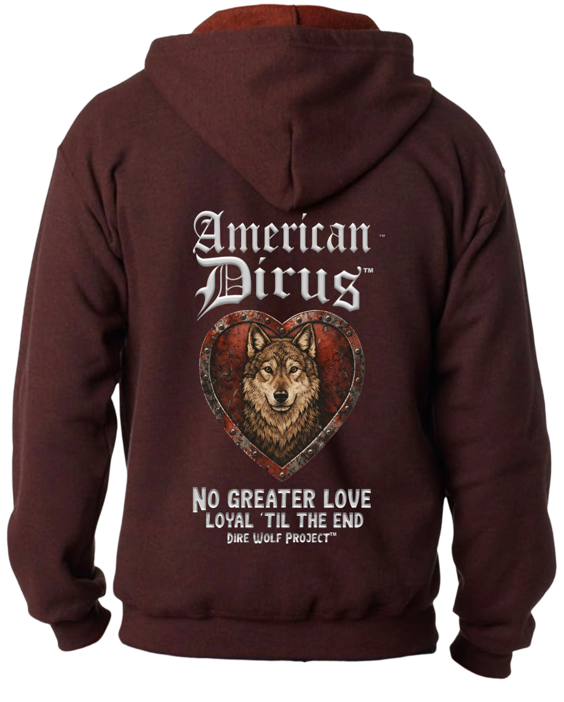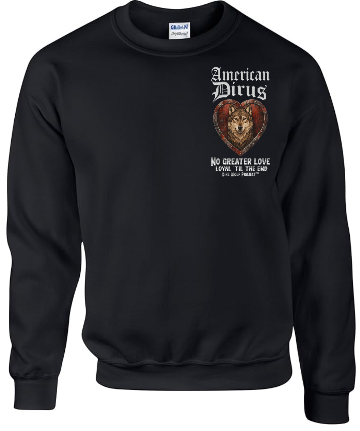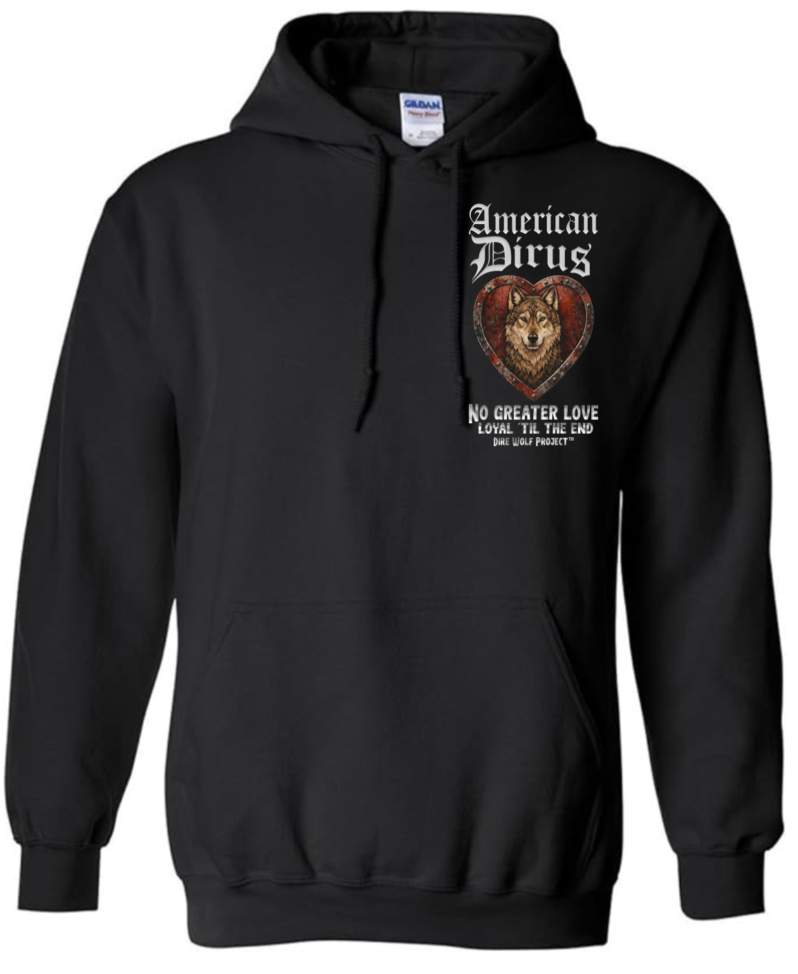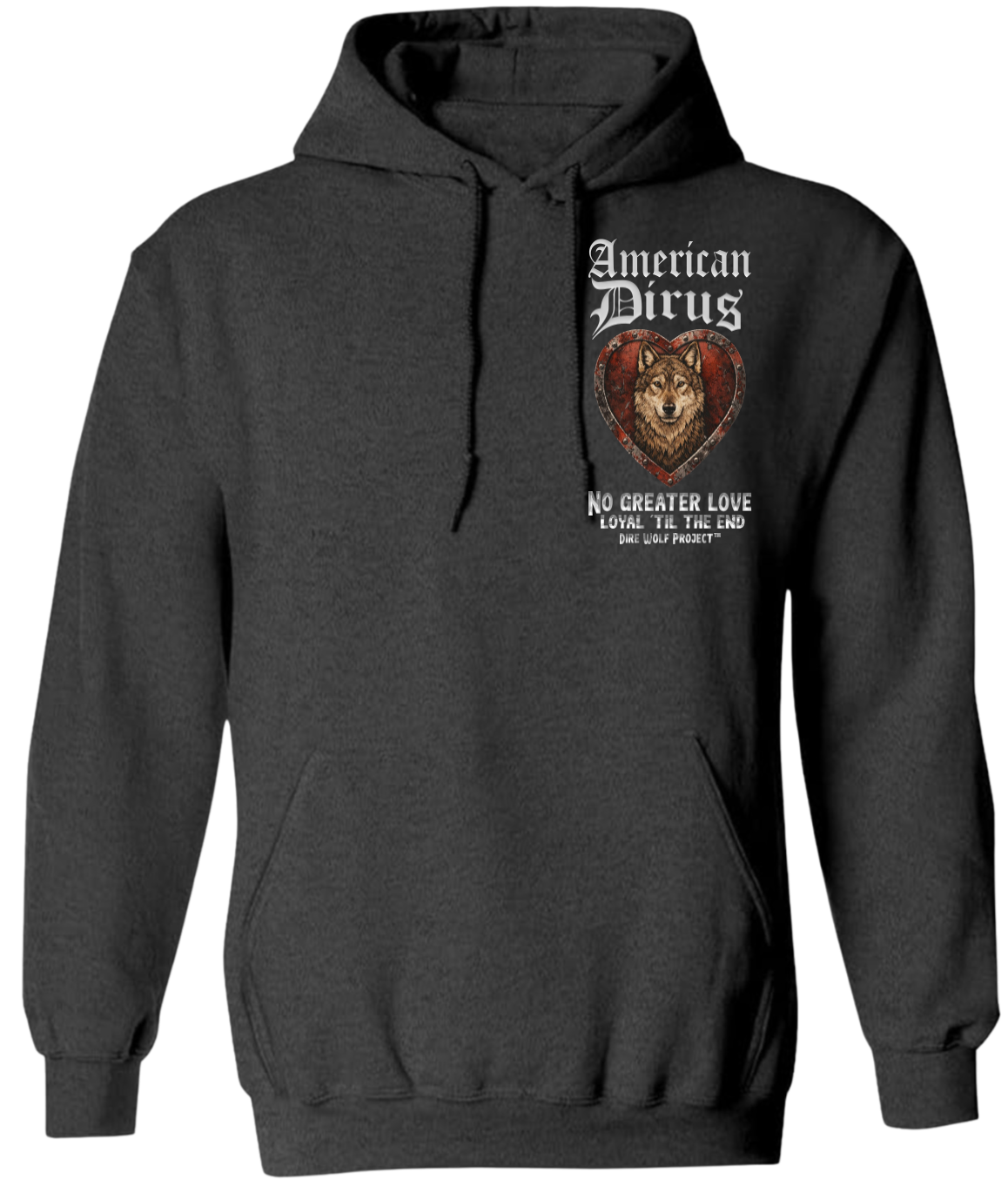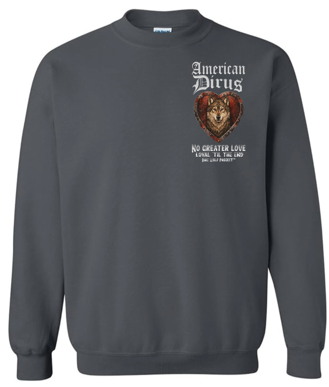 At the center of this shirt stands an American Dirus™, framed within a weathered heart of deep crimson and steel. The heart is not delicate. It is forged. Reinforced. Riveted like armor. Because the love it represents was never fragile.